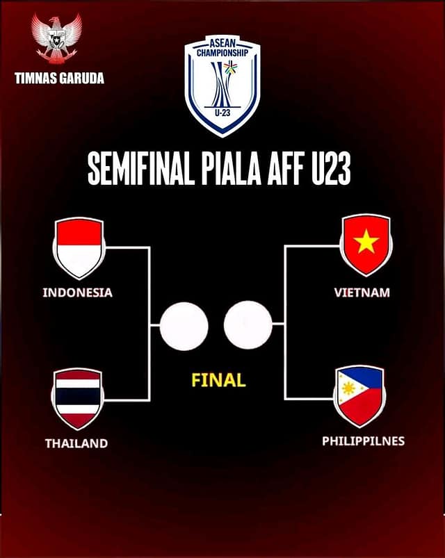 PUNGGAWASPORT, JAKARTA – Babak semifinal Piala AFF U-23 2025 telah terbentuk dengan empat tim yang berhasil melenggang ke putaran empat besar. Timnas Indonesia U-23 akan berhadapan dengan Thailand, sementara Vietnam bakal melawan Filipina dalam partai semifinal yang dijadwalkan berlangsung pada Jumat (25/7) mendatang.